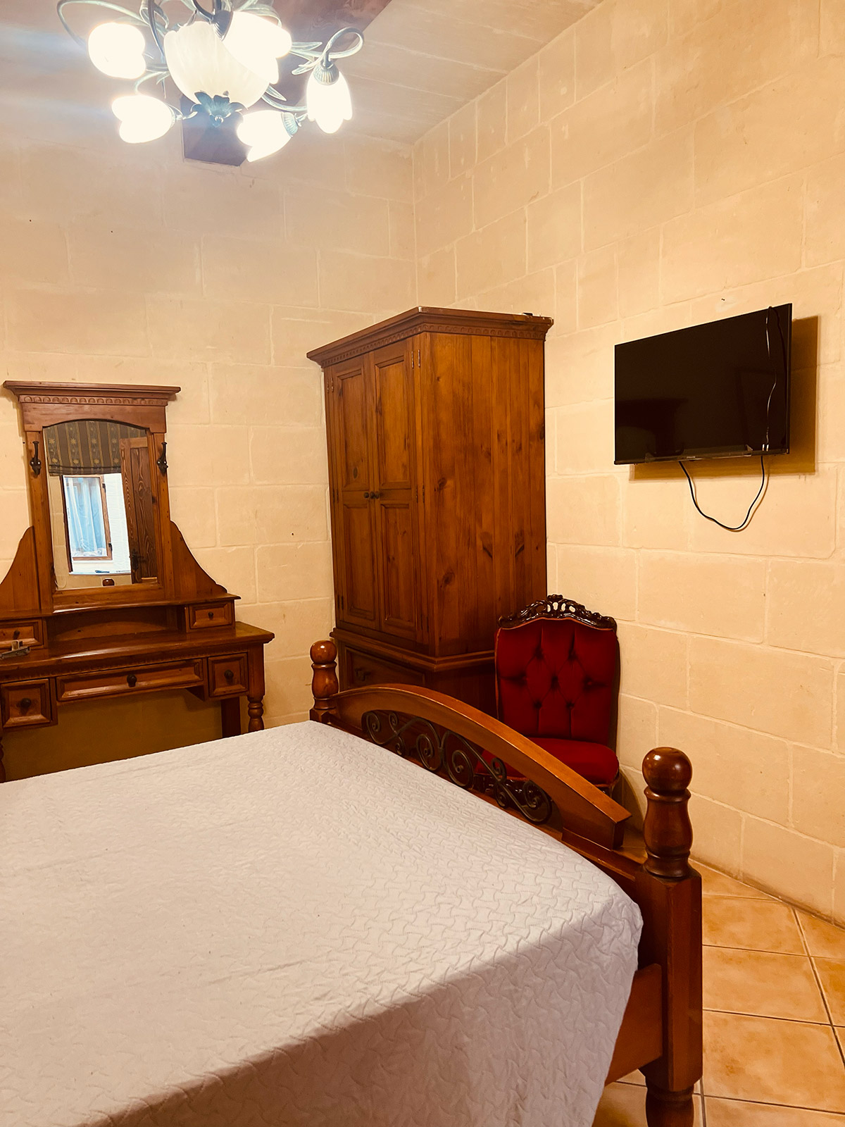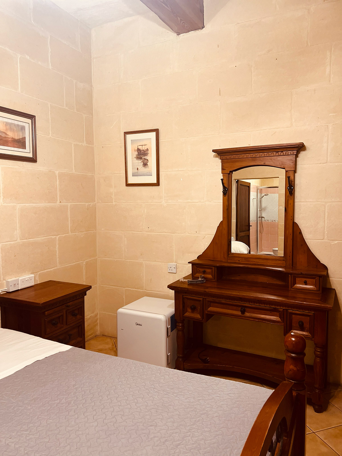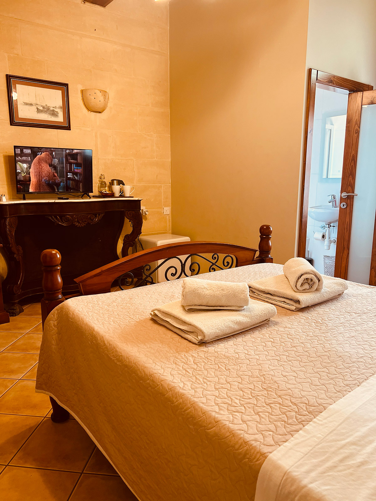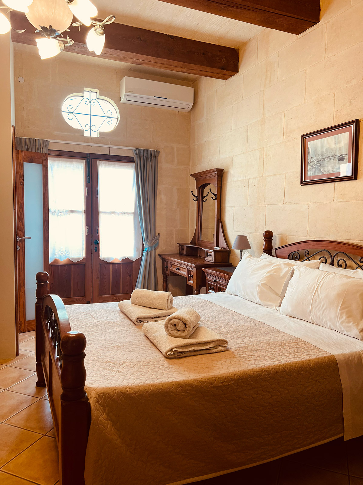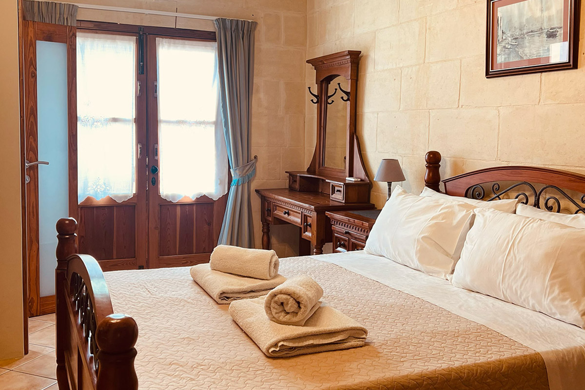 A calm double room with a private entrance and views over the village. It includes a walk-in shower, bathtub, minibar, sound-insulated walls, air-conditioning, and a flat-screen TV. A quiet, comfortable base for exploring Gozo.